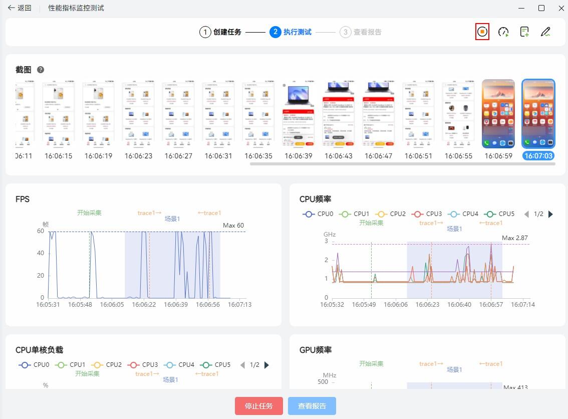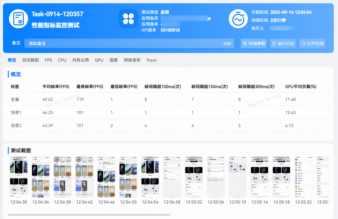 ****性能指标监控测试:****为用户提供指定业务场景性能测试能力,选择待测应用后手动操作应用,输出测试过程中应用和整机的性能指标数据。