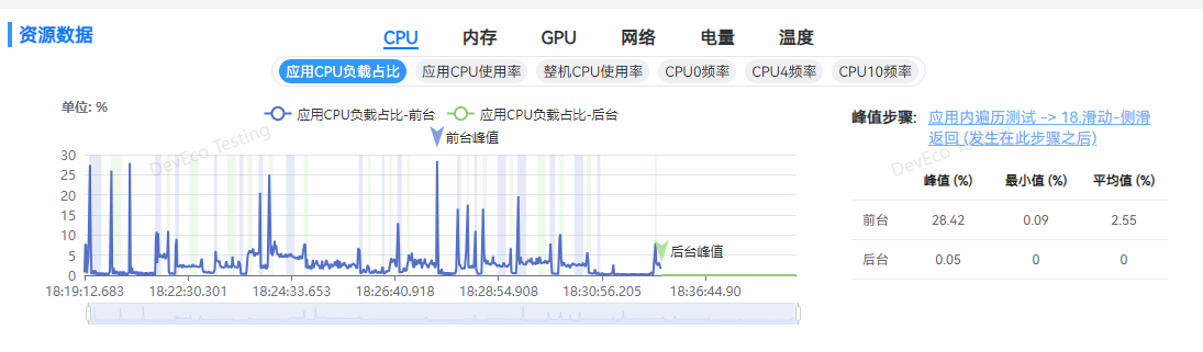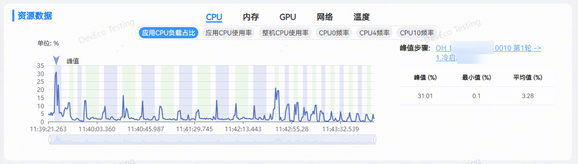- 峰值步骤:展示的是当前系统资源指标的最大值,点击可跳转至对应的步骤详情。