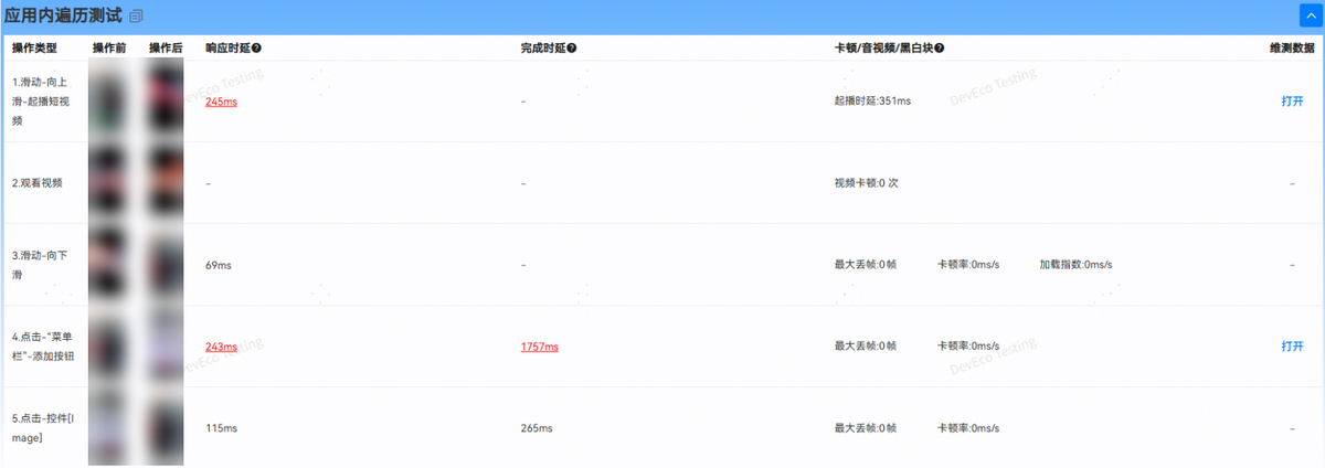 展示应用内进行遍历操作的步骤信息,包括操作前后截图、测试数据以及维测数据。