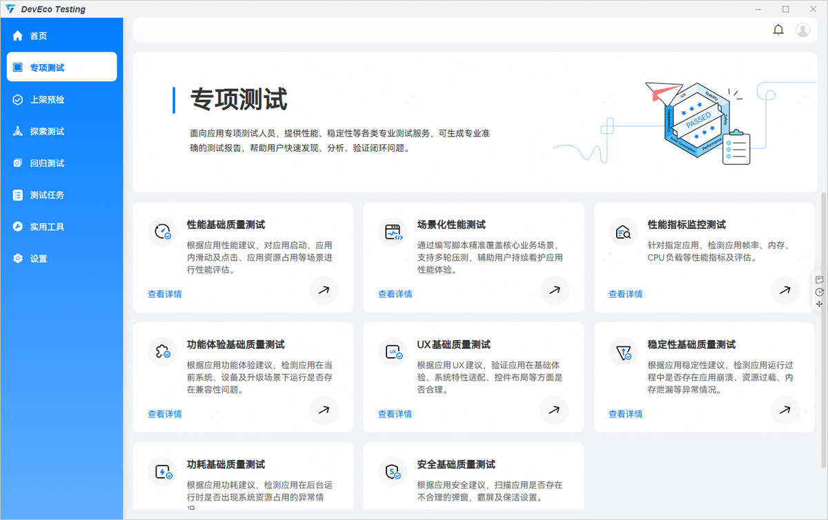 了解更多测试服务详情,请前往DevEco Testing客户端->专项测试->功能体验基础质量测试->任务创建页->测试指南中查询。