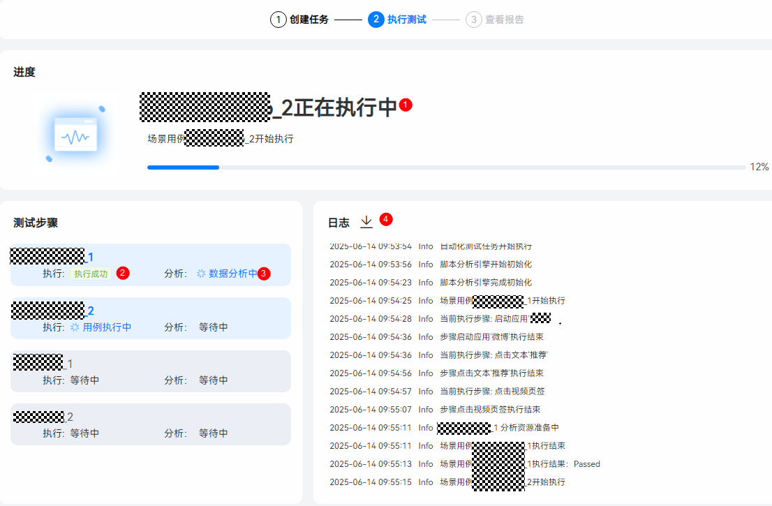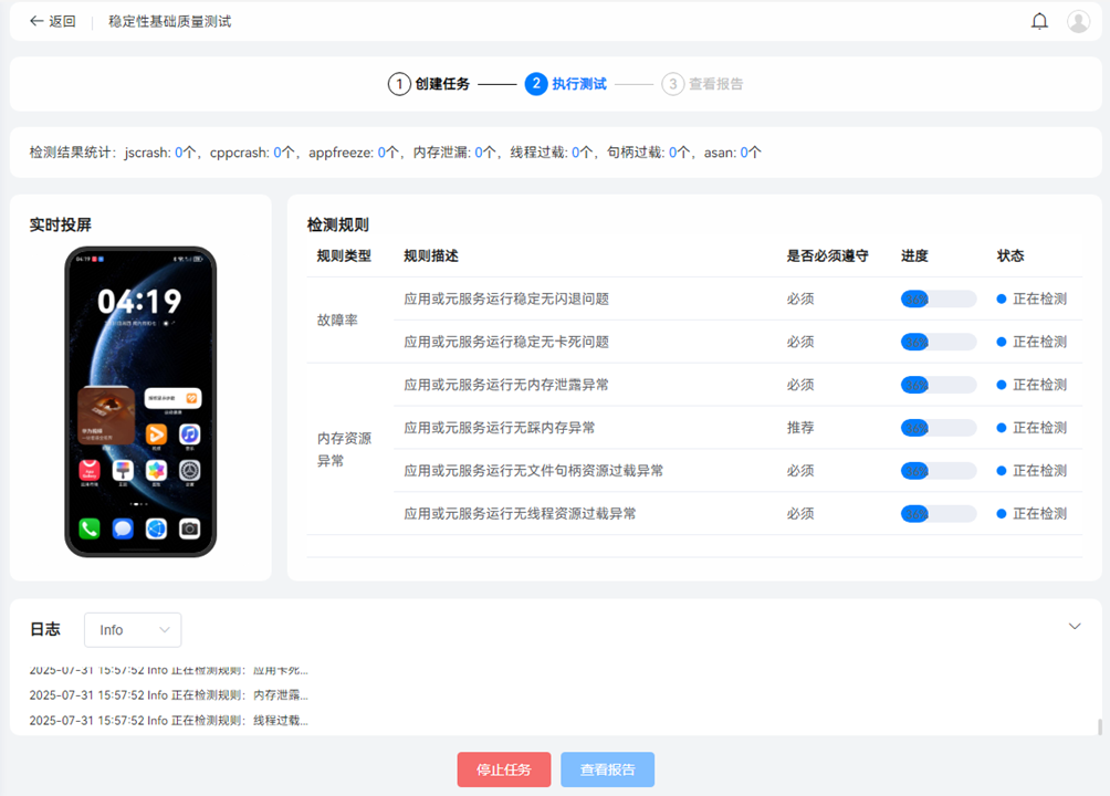 测试过程中,在测试页面可以看到测试进度、检测状态、实时投屏及执行日志。