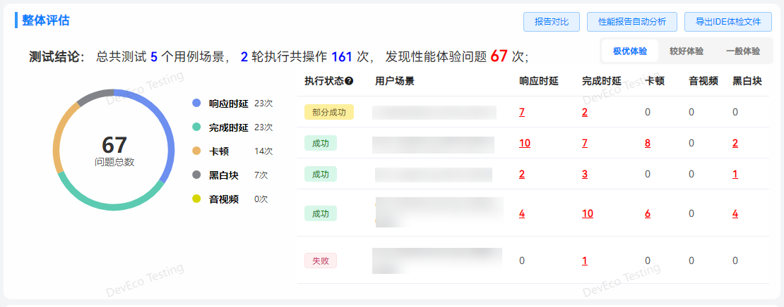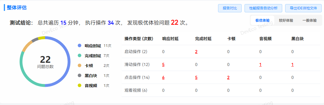 整体评估表格中的红色数字表示当前体验标准下的问题次数,支持点击查看问题步骤列表。