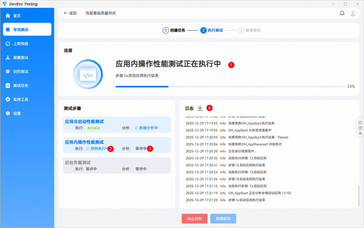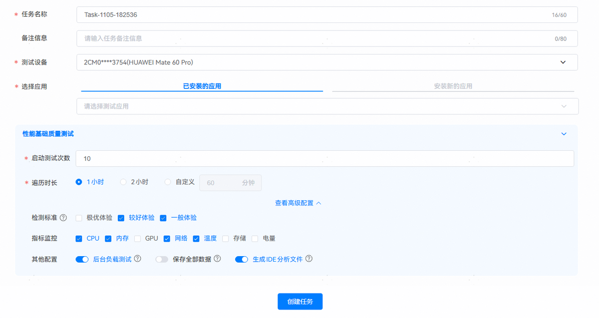 打开DevEco Testing客户端-专项测试-性能基础质量测试卡片,在任务创建界面按需配置任务参数,点击创建任务后开始测试。