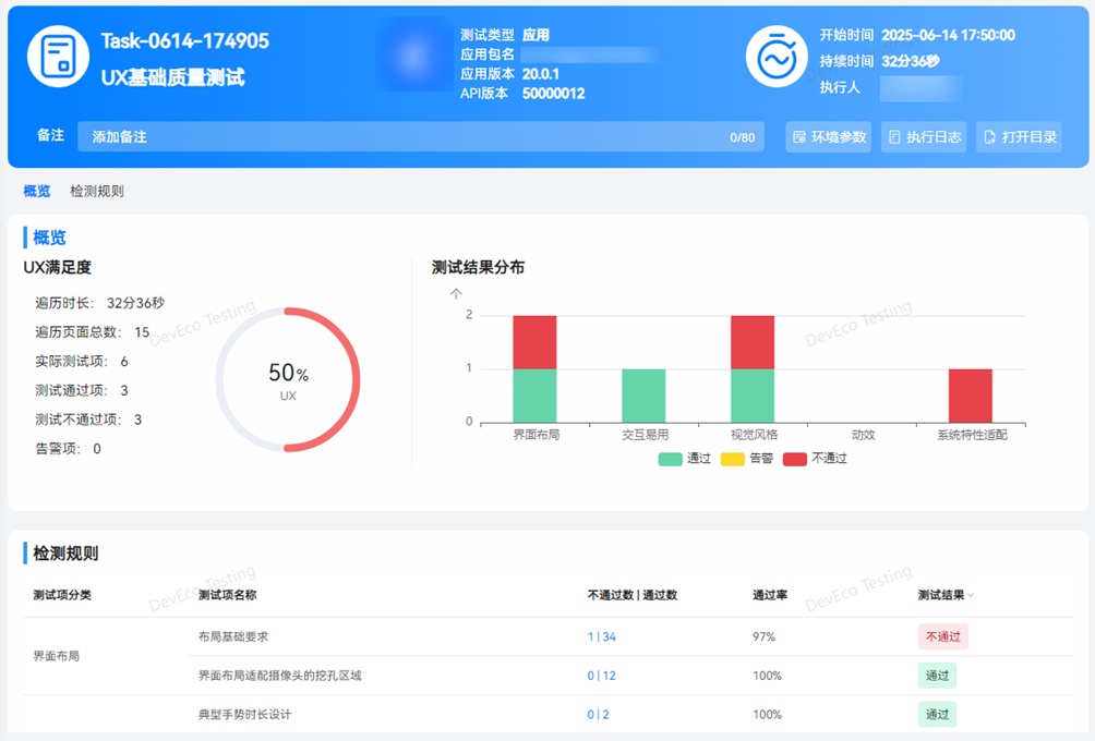测试完成后,自动生成测试报告。报告包含任务信息、执行结果、问题统计、检测规则。支持查看当前应用信息、任务执行时长及详细的环境参数,点击打开目录按钮可导出 html 格式报告。