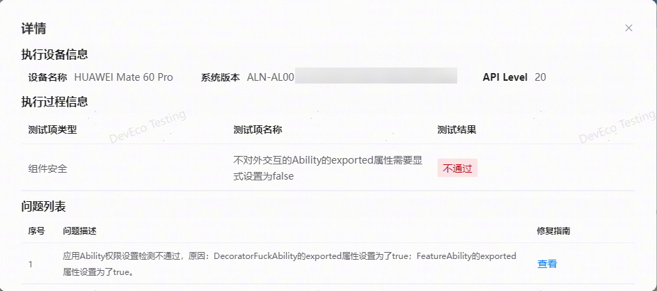 对于检测不通过的规则项,点击查看详情即可查看异常问题详情,包含执行设备信息、执行过程信息和问题列表;问题列表中有序号、问题描述和修复指南。