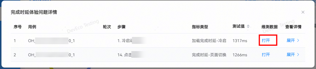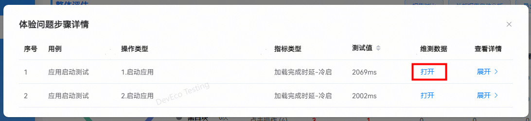 指标项:展示应用启动过程的指标检测结果信息,如果测试值超标,字体标红显示,支持点击查看问题详情。若不涉及,则显示”-”。