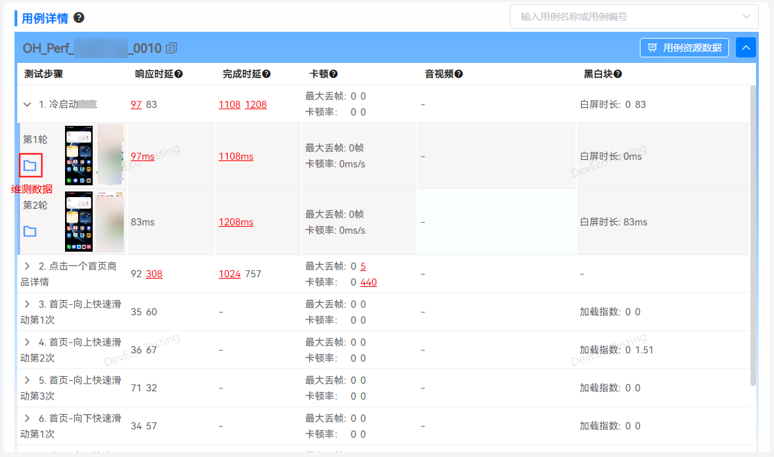 测试步骤:展示用例的步骤信息,默认展示该步骤在多轮测试中的测试数据,对于超过标准的测试值,数据标红显示,支持点击查看问题详情。对于该操作不涉及的指标,显示“-”。