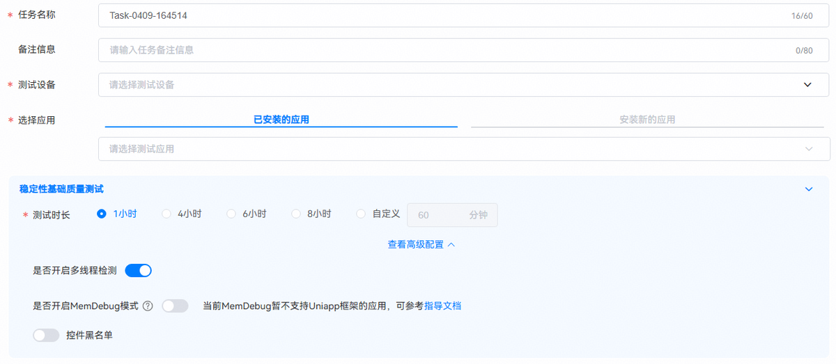 是否卸载应用:选择卸载应用后,测试时会进行卸载无残留检测,测试任务结束后将自动卸载被测应用。