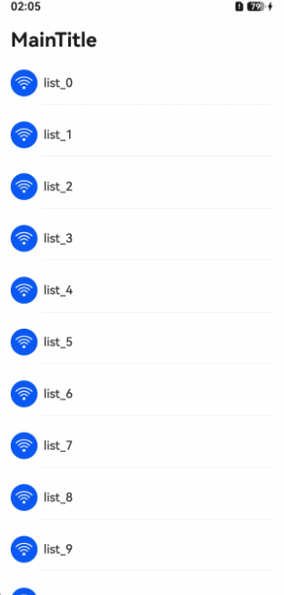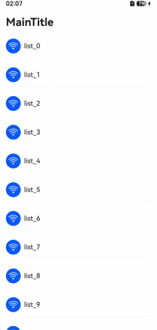 @Entry@Componentstruct Index {scroller: Scroller = new Scroller();private arr: number[] = [0, 1, 2, 3, 4, 5, 6, 7, 8, 9, 10, 11, 12, 13, 14, 15, 16, 17, 18, 19, 20];build() {HdsNavigation() { // 创建HdsNavigation组件List({ space: 12, initialIndex: 0, scroller: this.scroller }) {ForEach(this.arr, (item: number) => {ListItem() {Column() {Row({ space: 8 }) {Button() {SymbolGlyph($r('sys.symbol.wifi')).fontColor([$r('sys.color.icon_on_primary')]).fontSize(24)}.width(35).height(35)Text('list_' + item).width('100%').height(72).fontSize(16).fontWeight(500)}Divider().margin({ left: 40 })}}.height(56)}, (item: number) => item.toString())}.margin({ left: 16, right: 16 }).clip(false) // 设置不对子组件超出当前组件范围外的区域进行裁剪,使内容区可以穿透到标题栏下方.cachedCount(3, true) // 设置列表中ListItem/ListItemGroup的预加载数量,列表穿透到标题栏下方不会消失.scrollBar(BarState.Off).edgeEffect(EdgeEffect.Spring, { alwaysEnabled: true })}.titleBar({enableComponentSafeArea: true, // 将标题栏设置为组件级安全区,内容区可避让标题栏style: { // 设置导航组件标题栏样式,推荐使用默认样式// 标题栏动态模糊样式,包括是否使能滚动动态模糊,动态模糊类型,动态模糊生效的滚动距离等scrollEffectOpts: {enableScrollEffect: true,scrollEffectType: ScrollEffectType.COMMON_BLUR,blurEffectiveStartOffset: LengthMetrics.vp(0),blurEffectiveEndOffset: LengthMetrics.vp(20)},originalStyle: { // 内容区滚动前初始样式设置backgroundStyle: { // 标题栏背板样式设置backgroundColor: $r('sys.color.ohos_id_color_background'),},contentStyle: { // 标题栏内容区样式设置,包括标题区域,菜单区域,返回按钮区域titleStyle: {mainTitleColor: $r('sys.color.font_primary'),subTitleColor: $r('sys.color.font_secondary')},menuStyle: {backgroundColor: $r('sys.color.comp_background_tertiary'),iconColor: $r('sys.color.icon_primary')},backIconStyle: {backgroundColor: $r('sys.color.comp_background_tertiary'),iconColor: $r('sys.color.icon_primary')}}},scrollEffectStyle: { // 内容区滚动超过blurEffectiveEndOffset后样式设置backgroundStyle: {backgroundColor: $r('sys.color.ohos_id_color_background_transparent'),},contentStyle: {titleStyle: {mainTitleColor: $r('sys.color.font_primary'),subTitleColor: $r('sys.color.font_secondary')},menuStyle: {backgroundColor: $r('sys.color.comp_background_tertiary'),iconColor: $r('sys.color.icon_primary')},backIconStyle: {backgroundColor: $r('sys.color.comp_background_tertiary'),iconColor: $r('sys.color.icon_primary')}}}},content: { // 标题栏内容设置title: { mainTitle: 'MainTitle' },}}).hideBackButton(true).bindToScrollable([this.scroller]) // 绑定导航组件和可滚动容器组件.titleMode(HdsNavigationTitleMode.MINI)}}