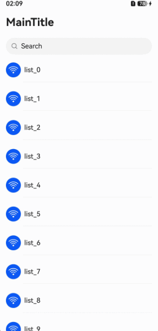 @Entry@Componentstruct Index {scroller: Scroller = new Scroller();private arr: number[] = [0, 1, 2, 3, 4, 5, 6, 7, 8, 9, 10, 11, 12, 13, 14, 15, 16, 17, 18, 19, 20];@BuilderbottomBuilder() {Column() {Search({ placeholder: 'Search' }).height(40).placeholderColor($r('sys.color.font_primary')).margin({ left: 16, right: 16 })}.width('100%')}build() {HdsNavigation() { // 创建HdsNavigation组件List({ space: 12, initialIndex: 0, scroller: this.scroller }) {ForEach(this.arr, (item: number) => {ListItem() {Column() {Row({ space: 8 }) {Button() {SymbolGlyph($r('sys.symbol.wifi')).fontColor([$r('sys.color.icon_on_primary')]).fontSize(24)}.width(35).height(35)Text('list_' + item).width('100%').height(72).fontSize(16).fontWeight(500)}Divider().margin({ left: 40 })}}.height(56)}, (item: number) => item.toString())}.margin({ left: 16, right: 16 }).clip(false) // 设置不对子组件超出当前组件范围外的区域进行裁剪,使内容区可以穿透到标题栏下方.cachedCount(3, true) // 设置列表中ListItem/ListItemGroup的预加载数量,列表穿透到标题栏下方不会消失.scrollBar(BarState.Off).edgeEffect(EdgeEffect.Spring, { alwaysEnabled: true })}.titleBar({content: {title: { mainTitle: 'MainTitle' },// 设置HdsNavigation BottomBuilder区域,包括设置高度,显示类型bottomBuilder: {builder: (): void => this.bottomBuilder(),height: 56,showType: BottomBuilderShowType.DIRECTLY_SHOW}},enableComponentSafeArea: true, // 将标题栏设置为组件级安全区,内容区可避让标题栏}).bindToScrollable([this.scroller]) // 绑定导航组件和可滚动容器组件.titleMode(HdsNavigationTitleMode.MINI).hideBackButton(true)// 设置HdsNavigation标题栏动态显隐,包括设置标题区域,bottomBuilder区域,状态栏区域是否动态隐藏,隐藏模式以及开始隐藏时内容区的滚动距离。.dynamicHideTitleBar({hideTitleArea: true,hideBottomBuilder: true,hideStatusBar: false,mode: HideMode.SCROLL_UP_TO,hideOffset: 10})}}
