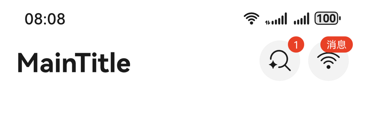 @Entry@Componentstruct Index {build() {HdsNavigation() { // 创建HdsNavigation组件}.titleBar({content: {// HdsNavigation标题栏内容设置menu: {// HdsNavigation标题栏菜单区域内容设置value: [{content: {// 第一个菜单项内容设置label: 'menu1',icon: $r('sys.symbol.AI_search'),isEnabled: true,},badge: {// 第一个菜单项信息提醒设置count: 1,}}, {content: {// 设置第一个菜单项内容,设置为普通文本按钮label: 'menu2',icon: $r('sys.symbol.wifi'),isEnabled: true,componentId: 'menu_1',action: () => {},},badge: {// 第二个菜单项信息提醒设置value: '消息'}}]},title: { mainTitle: 'MainTitle' },}}).titleMode(HdsNavigationTitleMode.MINI).hideBackButton(true)}}