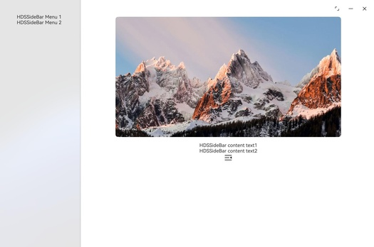 @Entry@ComponentV2struct Index {@Local isSideBarContainerMask: boolean = true;@Local blankHeight: number = 48;@Local isAutoHide: boolean = false;@Local isShowSidebar: boolean = true;@Local triggerValueReplace: number = 0;//左侧侧边栏区@BuilderSideBarPanelBuilder() {Column() {Blank().height(this.blankHeight)Text('HDSSideBar Menu 1').fontSize(14)Text('HDSSideBar Menu 2').fontSize(14)}.width('100%').height('100%')}//右侧内容区@BuilderContentPanelBuilder() {Column(){Blank().height(this.blankHeight)Image($r('app.media.view')) // view为自定义资源,开发者需替换本地资源.width('80%').height('50%').margin({ top: 8 }).padding({right: '16vp',left: '16vp',bottom: '16vp',}).borderRadius(8)Column() {Text('HDSSideBar content text1').fontSize(14)Text('HDSSideBar content text2').fontSize(14)}Button() {SymbolGlyph(this.isShowSidebar ? $r('sys.symbol.open_sidebar') : $r('sys.symbol.close_sidebar')).fontWeight(FontWeight.Normal).fontSize($r('sys.float.ohos_id_text_size_headline7')).fontColor([$r('sys.color.ohos_id_color_titlebar_icon')]).hitTestBehavior(HitTestMode.None)}.id('side_bar_button').backgroundColor($r('sys.color.ohos_id_color_button_normal')).height(24).width(24).animation({ curve: Curve.Sharp, duration: 100 }).onClick(() => {this.isShowSidebar = !this.isShowSidebar;})}}@BuilderParam contentBuilder: () => void = this.ContentPanelBuilder@BuilderParam sideBarBuilder: () => void = this.SideBarPanelBuilder@BuilderHDSSideBarBuilder() {HdsSideBar({sideBarPanelBuilder: (): void => {this.sideBarBuilder()},contentPanelBuilder: (): void => {this.contentBuilder()},autoHide: this.isAutoHide,contentAreaMask: this.isSideBarContainerMask,sideBarContainerType: SideBarContainerType.Embed,isShowSideBar: this.isShowSidebar,$isShowSideBar: (isShowSidebar: boolean) => {this.isShowSidebar = !isShowSidebar},})}@Builderbuild() {Stack() {this.HDSSideBarBuilder()}}}