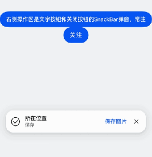 @Entry@ComponentV2struct TestSnackBar {uiContext: UIContext = this.getUIContext();hdsSnackBar: HdsSnackBar = new HdsSnackBar(this.uiContext);icon: SnackBarIconOptions = {icon: $r('sys.symbol.checkmark_circle')}message: SnackBarMessageOptions = {title: $r('sys.string.ohos_id_text_location_button_description_current_position'),content: $r('sys.string.ohos_id_text_save_button_description_save')}operation: SnackBarOperationOptions = {operationType: SnackBarOperationType.TEXT_WITH_CLOSE,content: $r('sys.string.ohos_id_text_save_button_description_save_image'),textButtonId: 'snackBarTextButton'}style: SnackBarStyleOptions = {nextFocusId: 'button',duration: -1}build() {Column() {Blank().height(400)Button('右侧操作区是文字按钮和关闭按钮的SnackBar弹窗,常驻').onClick(() => {this.hdsSnackBar.show(this.icon, this.message, this.operation, this.style);}).id("button")Button('关注').nextFocus({// 这里forward的id必须和SnackBarOperationOptions接口中传入的textButtonId相同forward: 'snackBarTextButton'})}.width('100%').height('100%').backgroundColor(0xF1F3F5)}}