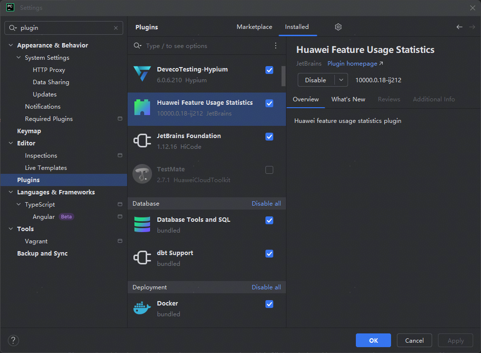 安装完成后在Plugins界面可以看到DevEcoTesting-Hypium插件。