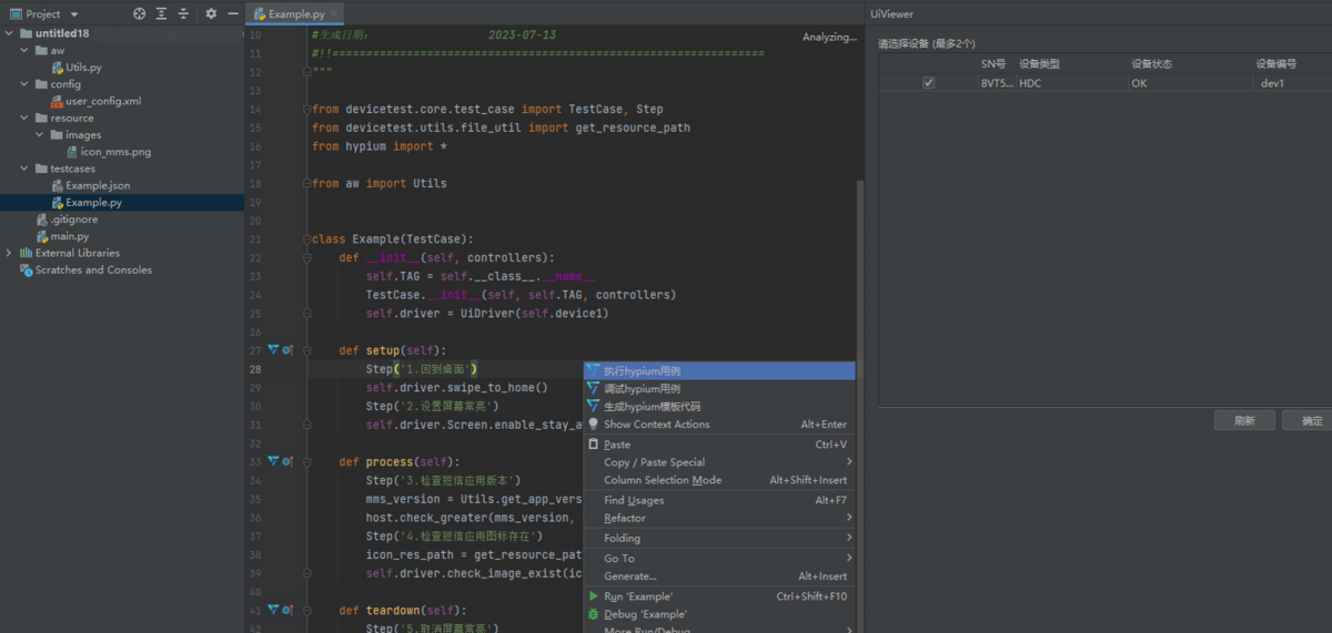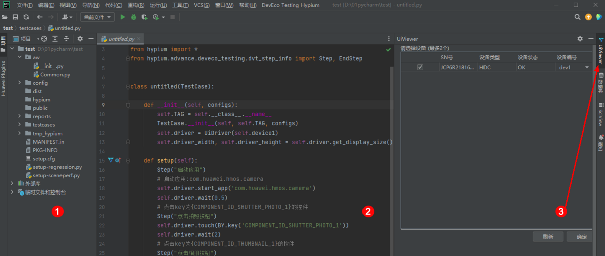 - Hypium提供了在PyCharm中使用的用例编写辅助插件,支持控件查看/投屏操作等多种用例开发辅助功能,提升用例开发体验和效率。