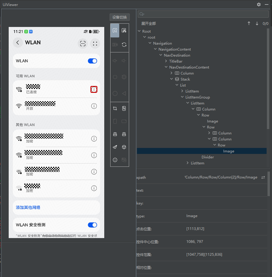 该工具区提供控件查看功能。进入控件查看模式后,设备画面将保持静止,不再实时更新。若需获取当前页面的最新控件信息,需手动点击“控件刷新”按钮以重新抓取页面结构和控件数据。