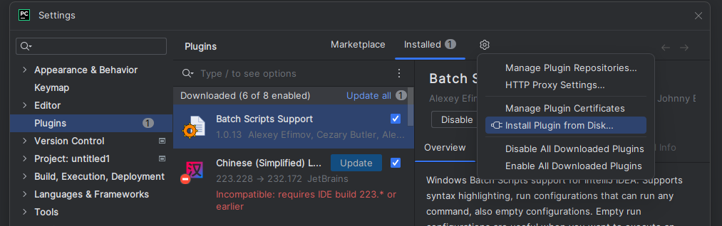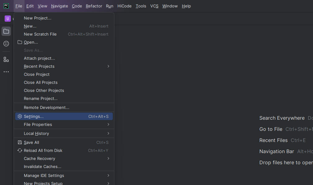 Ⅱ. 打开PyCharm后,点击File -> Settings -> Plugin -> 齿轮图标 -> Install Plugin from Disk。在弹出的文件选择器中,选择第一步下载的hypium-pycharm-plugin-6.0.6.210.zip(该版本号仅做示例,请以实际版本号为准)离线安装包,完成安装。安装完成后,重启PyCharm即可使用新安装的Deveco Testing Hypium插件。
