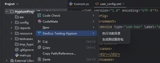 在项目文件区域右键点击项目目录或者文件,选择 DevEco Testing Hypium,弹出对应的功能菜单。