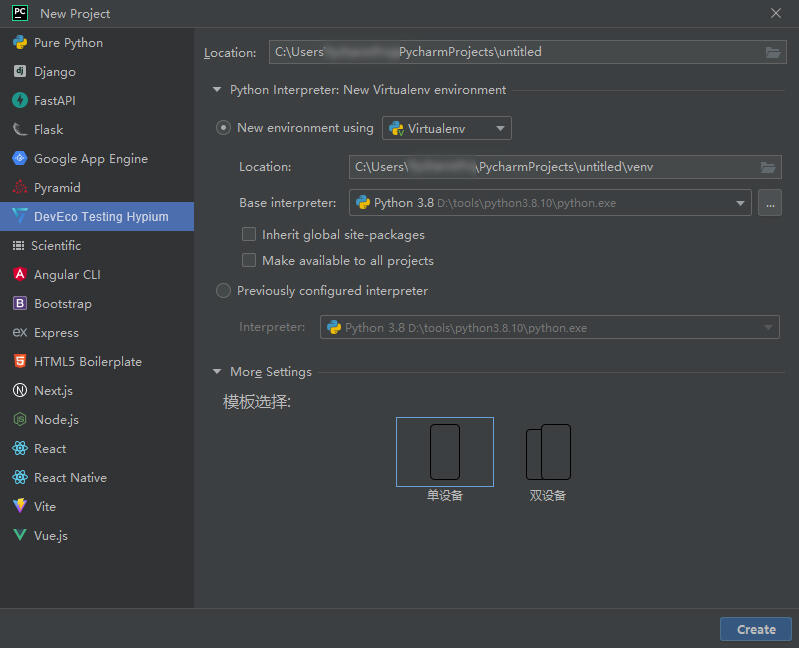 项目创建功能只支持2022.3至2025.1的PyCharm版本。2024.3版本由于pycharm自身原因,只能选择单设备模板进行创建。