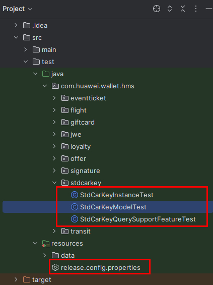 使用Intellij IDEA打开钱包服务-服务端卡片开通的示例代码,没有请先下载Intellij IDEA的当前最新版本。示例代码和工具下载完成后,目录结构如下,我们需要关注下图框出来几个文件:
