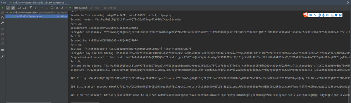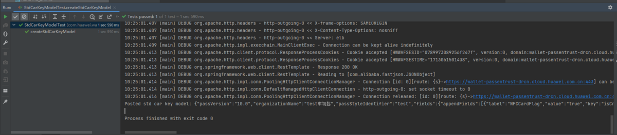 打开stdcarkey/StdCarKeyInstanceTest.java文件,运行addStdCarKeyInstance方法,可看到控制台如下输出,详细见申请钥匙卡片的响应参数。