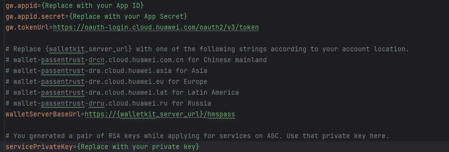 需替换的参数 参数说明 gw.appid gw.appid.secret AppGallery Connect平台申请的Client ID和Client Secret分别填入gw.appid和gw.appid.secret walletServerBaseUrl 固定填入服务器基地址: https://wallet-passentrust-drcn.cloud.huawei.com.cn/hmspassservicePrivateKey 创建Wallet Kit服务步骤5生成的私钥 -