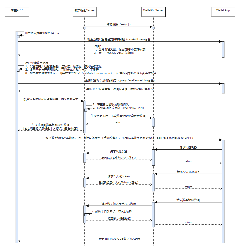 - 用户主动发起开卡时,车主APP跳转钱包应用,调用addPass接口携带上述流程中生成的编码后的JWE数据,开通车钥匙到钱包。