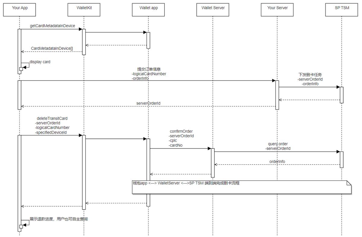 交通卡的删卡过程分为:卡片展示、生成删卡业务订单和发起删卡三个步骤,整体流程如下图,相关接口定义请参照钱包服务API。