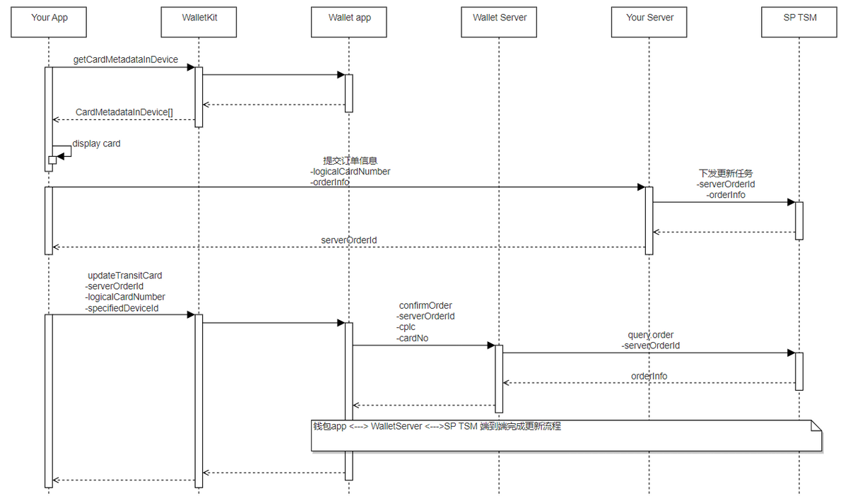 交通卡的更新可以用在更新卡片有效期等卡内数据的场景,其过程分为:卡片展示、生成更新业务订单和发起更新三个步骤,整体流程如下图,相关接口定义请参照钱包服务API。